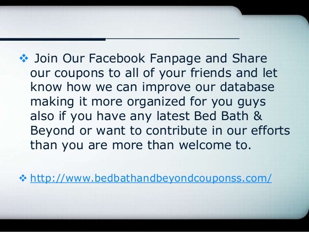 Bed Bath and Beyond Coupons, Promo Codes & Cash Back Find the latest Bed Bath and Beyond promo codes, coupons & deals for June 2022 - plus earn 3.0% Cash Back at Rakuten. Join now for a free $10 Welcome Bonus. Shop smarter at Bed Bath and Beyond! $10 Welcome Bonus when you join Rakuten today.