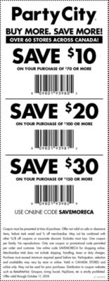 Party City Coupons: Save w/ Coupon Code, Printable Coupon Promo 15% Off Any Halloween Purchase of $49+. Click through and tap 'copy & go' to redeem 15% off any halloween purchase of $49 or more throughout the site at Party City. Coupon valid now through October 10th. ... TEM Show Coupon Code. 20% Off code.